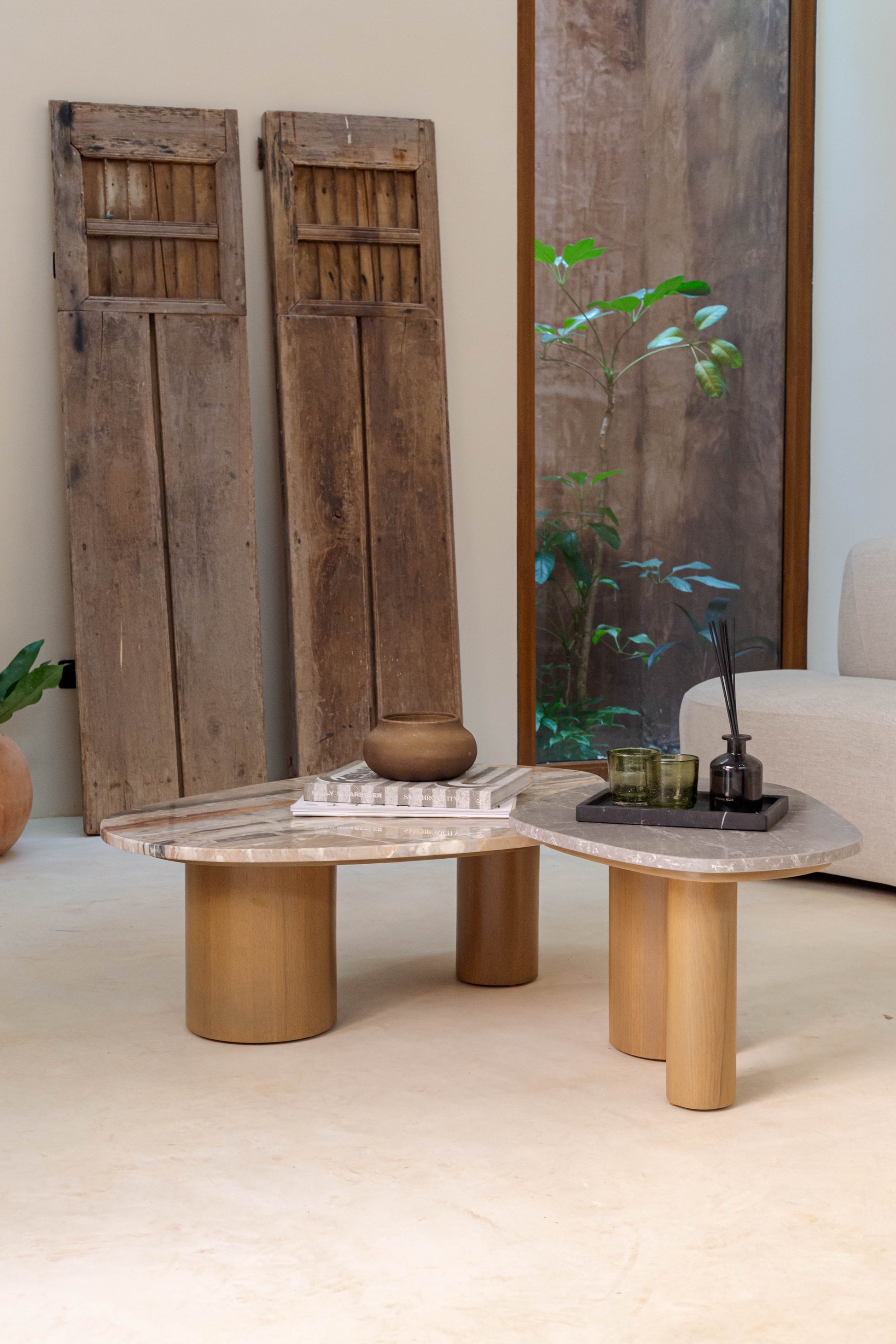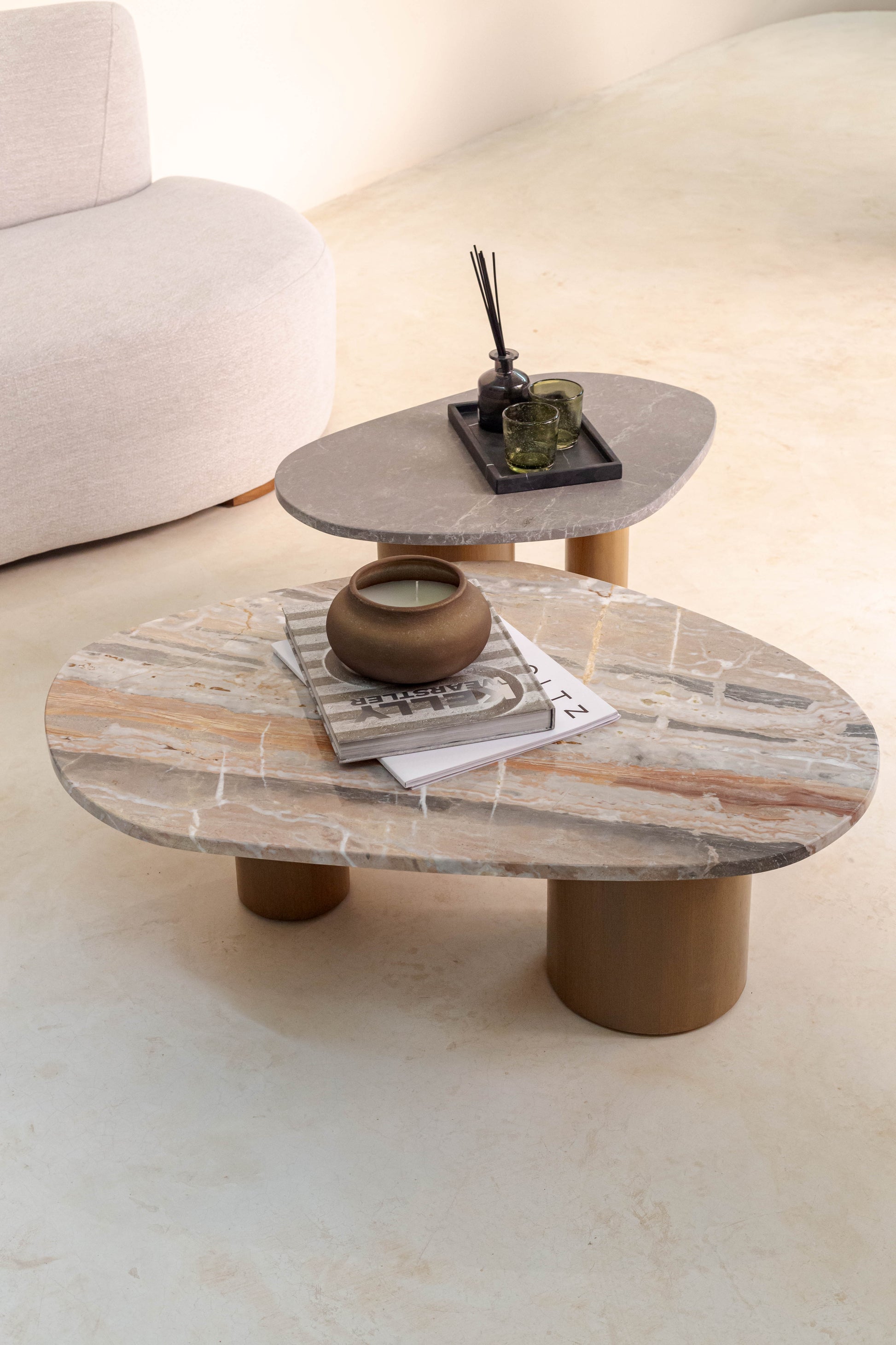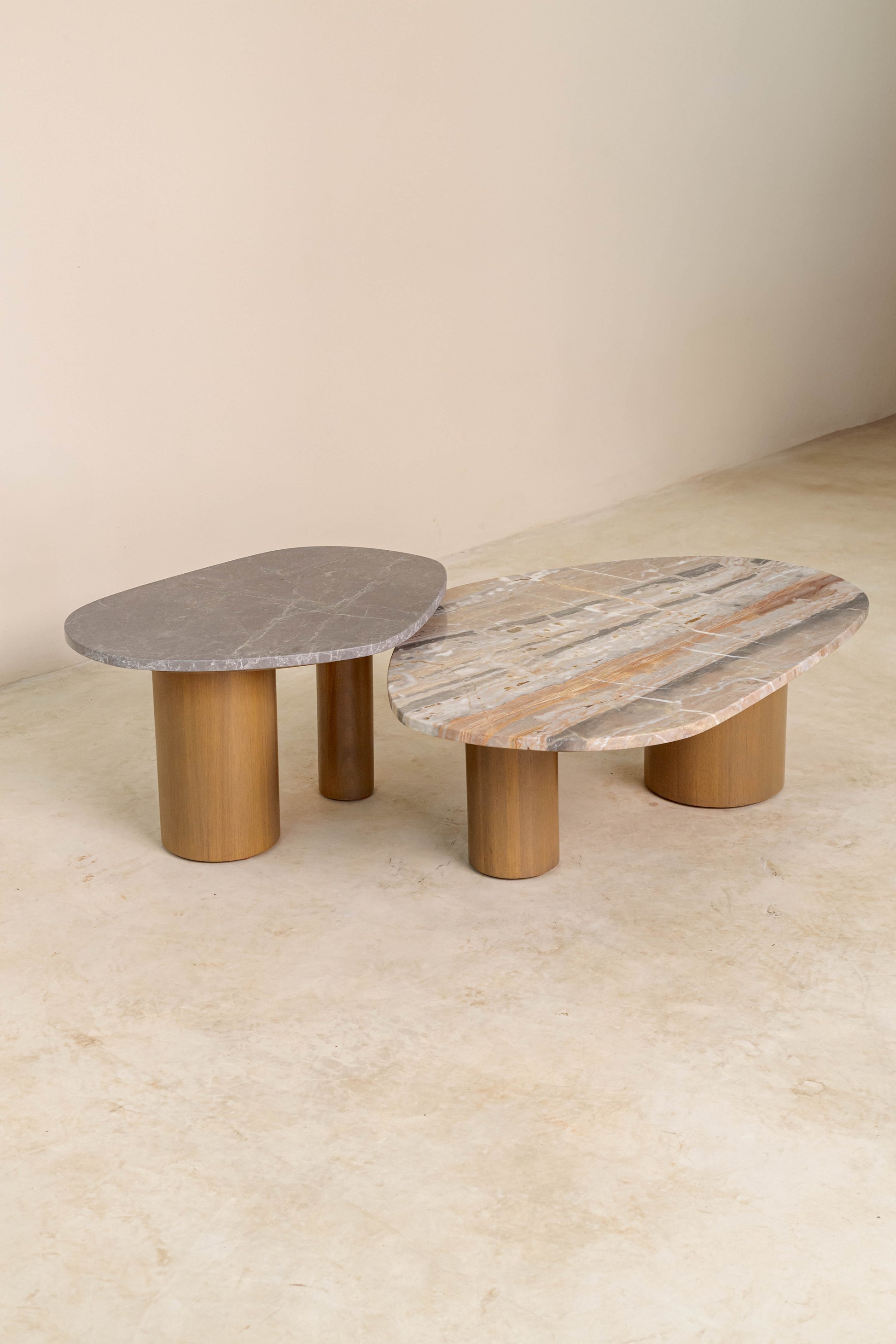 El set incluye dos mesas elaboradas en Mármol Arabescatto Rosso y Mármol Gris Rochelle.