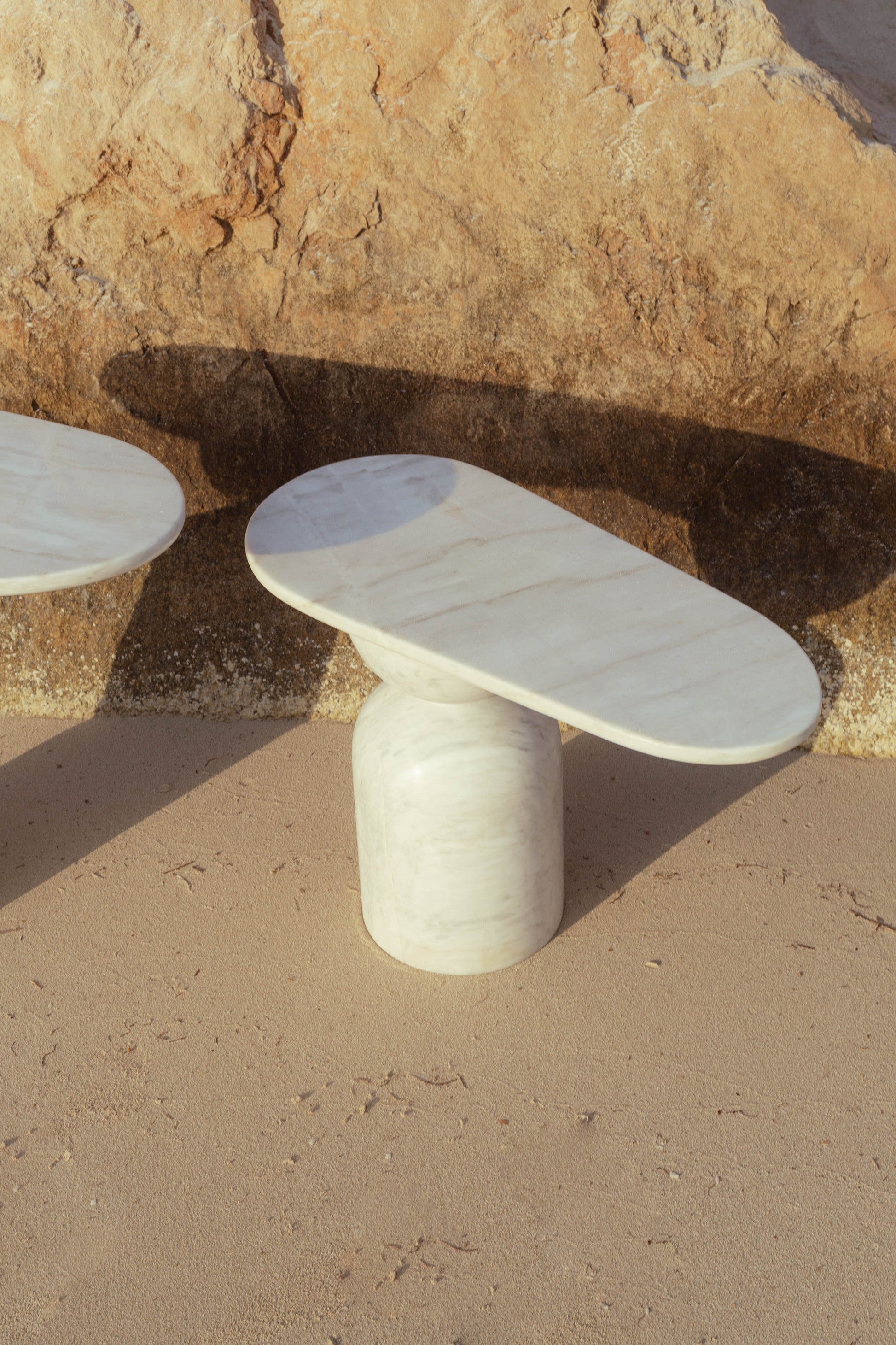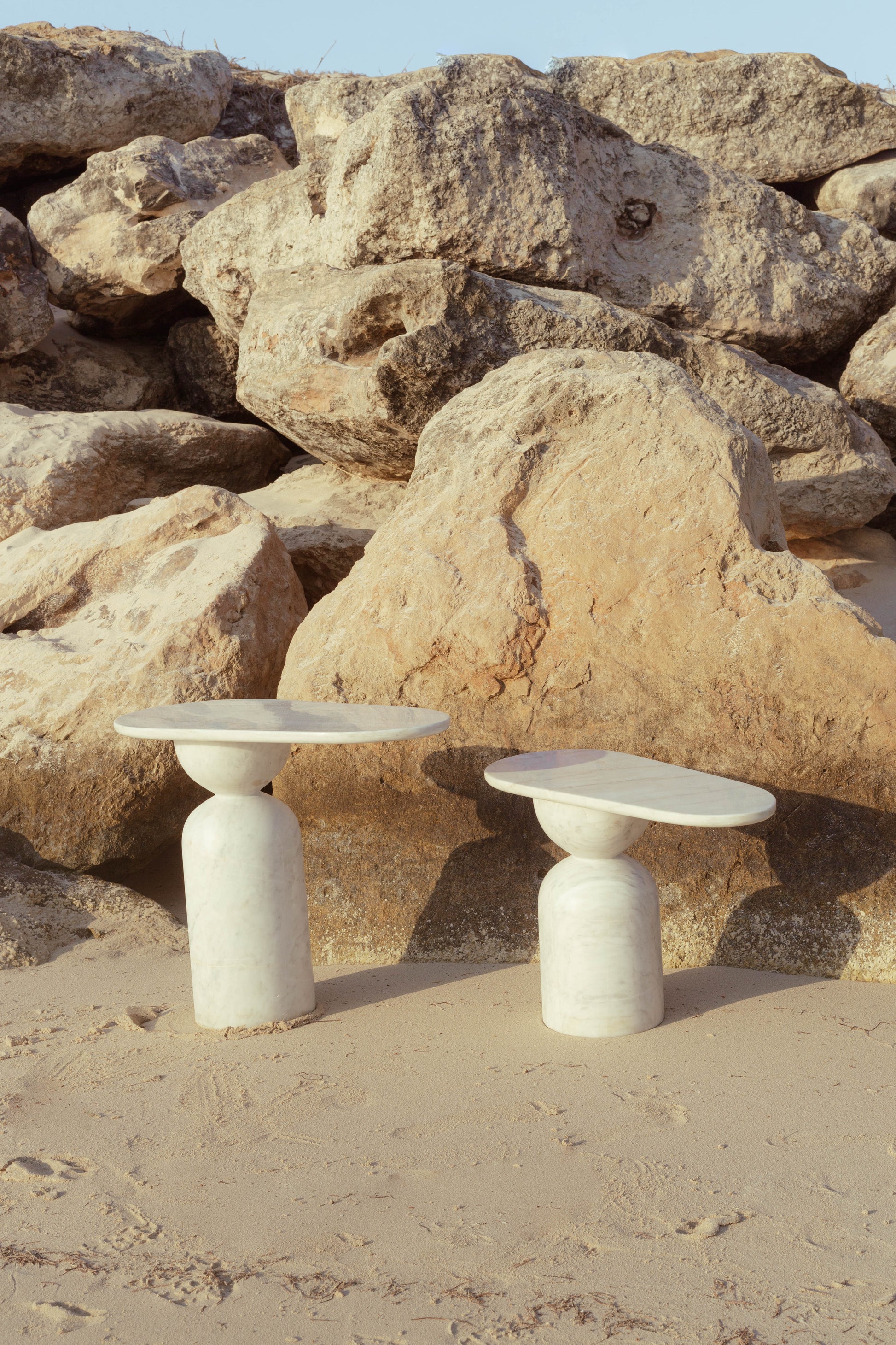 El set incluye dos mesas, ambas en Mármol Bego.