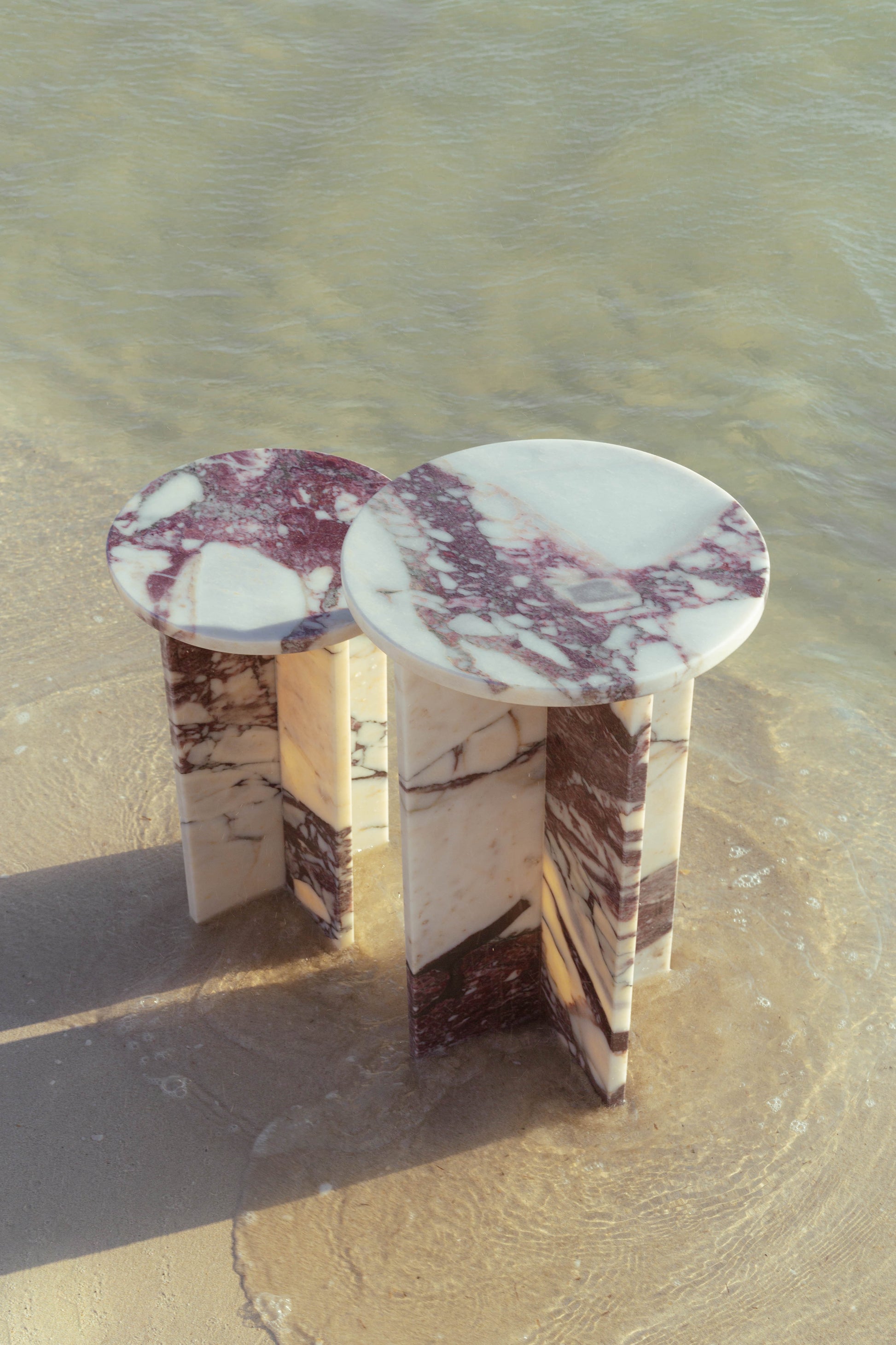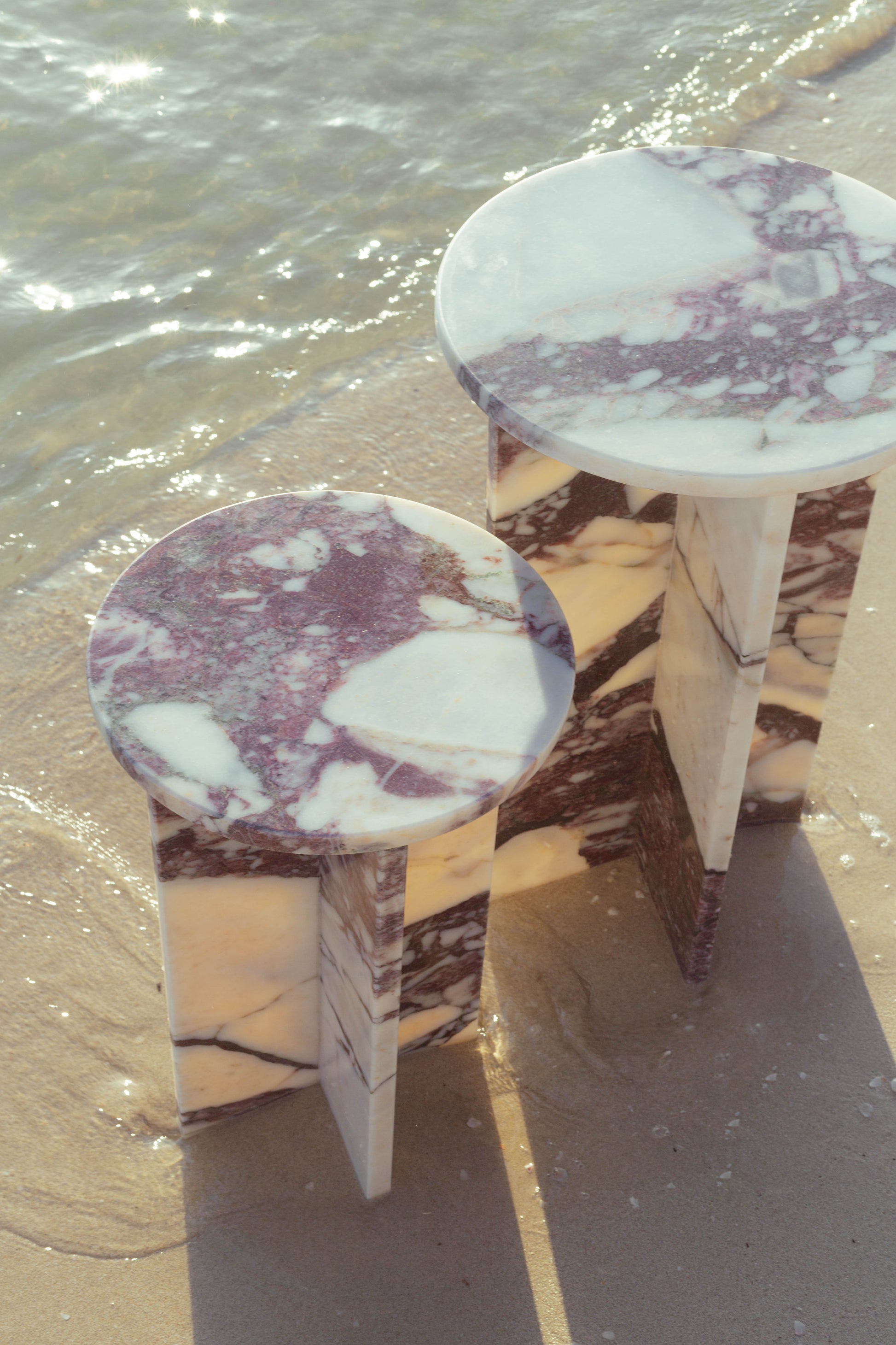 El set incluye dos mesas, ambas en Mármol Calacatta Viola.